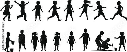 © Moksedul Creative, Naklejka premium Silhouette of children playing, walking, running, and standing together, perfect for education, family, childhood concept, and vector illustration.