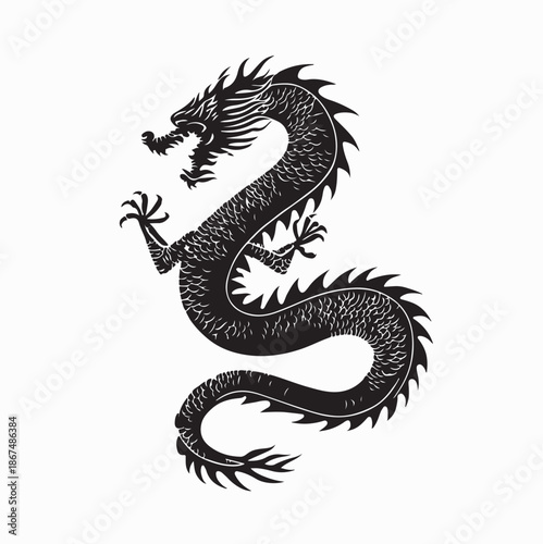 © Edo, Fototapeta premium Silhouette Of Chinese Dragon Crawling Stock Illustration on White Background