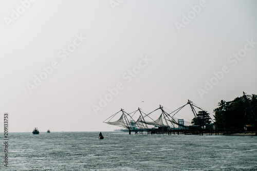 Naklejka premium Silhouette of chinese fishing nets in fort kochi during sunset.