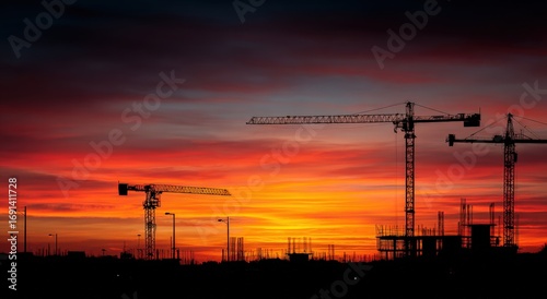 © fatma, Fototapeta premium Silhouette of construction site at sunset