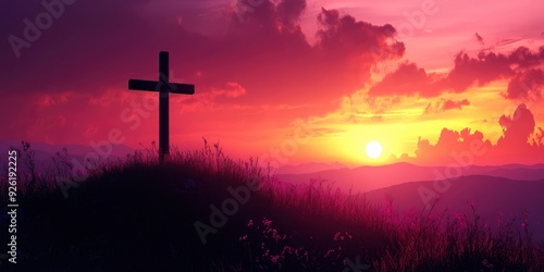 © Dzikrul Husnani, Obraz premium Silhouette of Cristian cross wood on top of hill at sunset , ai