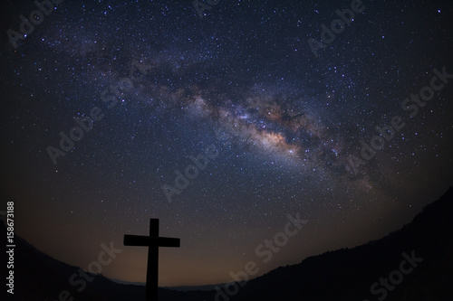 © sripfoto, Naklejka premium Silhouette of cross over milky way background,Long exposure photograph.