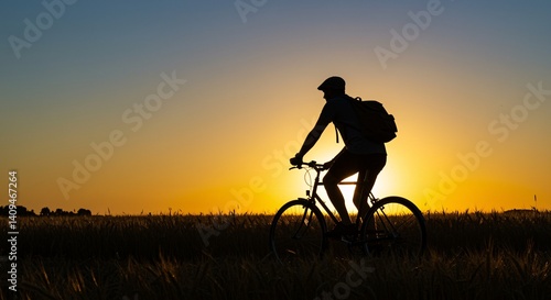 © Mahfuz, Obraz premium Silhouette of cyclist enjoying sunset ride through a field.