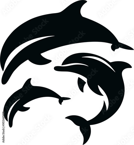 Naklejka premium Silhouette of dolphins jumping, simple black shapes on a white background