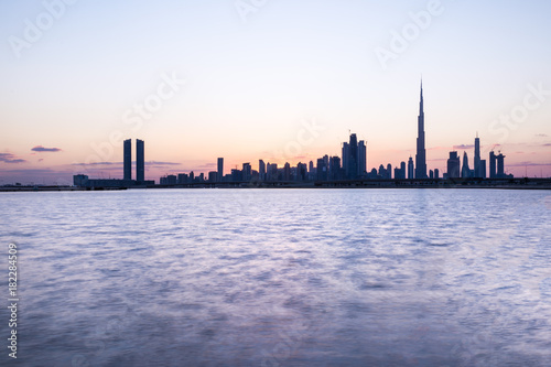 Fototapeta premium Silhouette of Dubai Downtown at sunset.