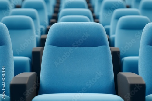 © Thanyarat, Fototapeta premium Silhouette of Empty Blue Cinema Interior with Rows of Unoccupied Seats and a Soft Blue Light, Capturing the Essence of Abandonment and Tranquility in a Movie Theater Setting