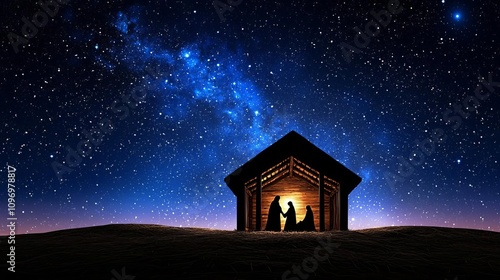 Fototapeta premium Silhouette of figures in a stable under a starry sky, symbolizing peace and...