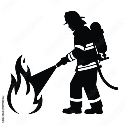 Fototapeta premium Silhouette of firefighter spraying water on fire with flames outline, black...