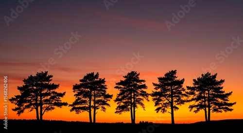 © Steffani, Obraz premium Silhouette of five trees against a vibrant sunset with colorful sky tones