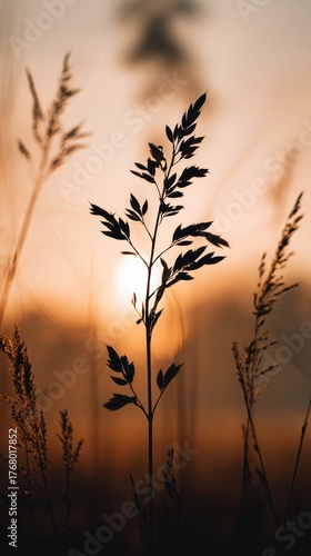 © paisorn, Fototapeta premium Silhouette of Grass Against Warm Sunset Background in Nature