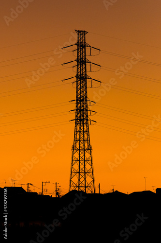 © hit1912, Fototapeta premium Silhouette of high voltage transmission tower