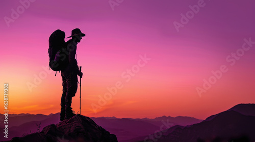 Fototapeta premium Silhouette of hiker standing on rock against vibrant sunset sky, showcasing shades of purple and orange. scene evokes sense of adventure and tranquility in nature