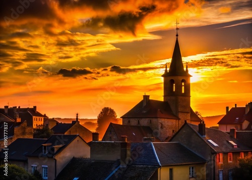 © prapatsorn, Fototapeta premium Silhouette of Historic Rions Village, France, Church Tower at Sunset