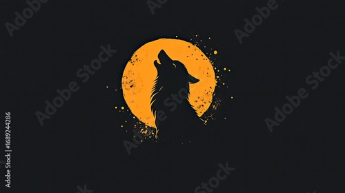 Fototapeta premium Silhouette of Howling Wolf Against Orange Moon, Minimalist Design, Dark...