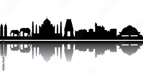 © Chris Willemsen, Naklejka premium Silhouette of Iconic Indian Landmarks and Wildlife Against White Background