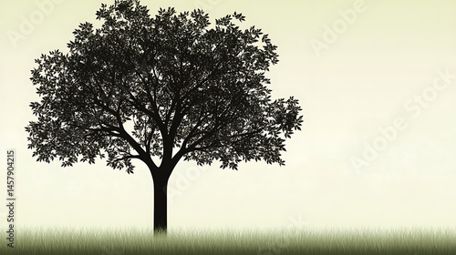 Fototapeta premium Silhouette of leafy tree standing on grass field with copy space on a light background