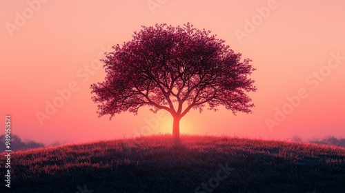 © kaiserseeing, Fototapeta premium Silhouette of Lone Tree on Grassy Hill at Sunset