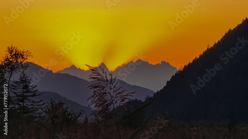 © Chris, Obraz premium Silhouette of majestic mountain peaks against backdrop of vibrant sunset. Panoramic viewing point at east bank of Weissensee in Carinthia, Austria. Gazing through tranquil forest, romantic atmosphere