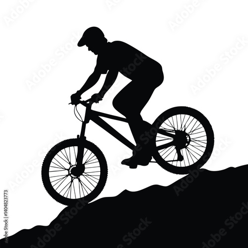 Fototapeta premium Silhouette of Man Cycling Downhill with Cap on Mountain, Transparent Background