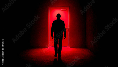 Obraz premium Silhouette of Man Walking Towards Bright Red Door or Light