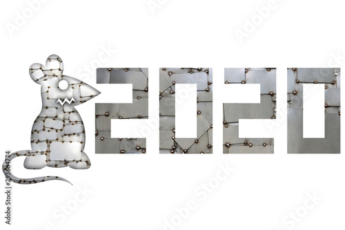 Obraz premium Silhouette of metal rat and figures on white background