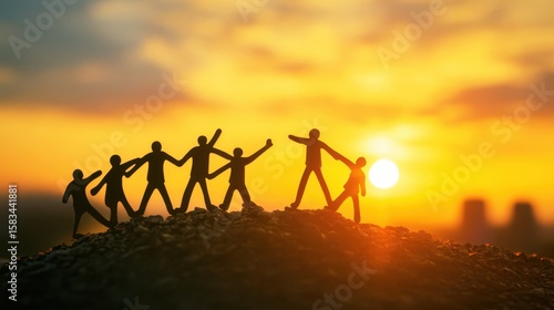 Obraz premium Silhouette of Miniature Figures Celebrating Unity at Sunset with Warm Colors...