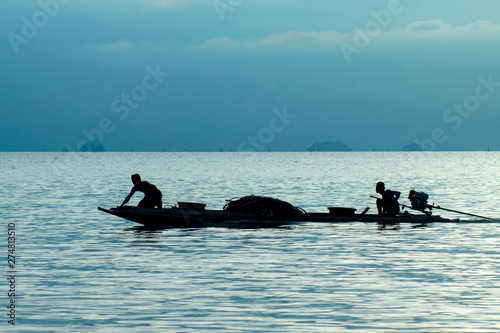 © noppharat, Naklejka premium Silhouette of minimal fishing boat in the blue hour on the lake.