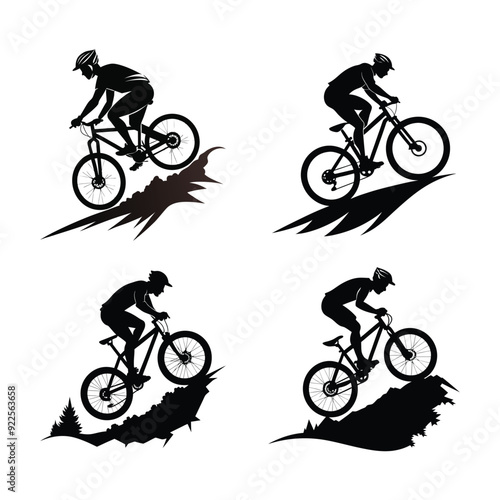© sabbir, Obraz premium "Silhouette of Mountain Biker Navigating Rough Trail with Front Wheel Lifted Over Bump, Emphasizing Rugged Pose and Motion on White Background"