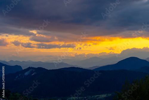 © senerdagasan, Obraz premium Silhouette of mountain range with partly cloudy sky at sunset.