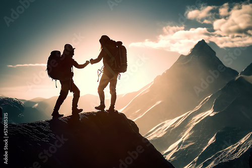 © bahadirbermekphoto, Fototapeta premium silhouette of mountaineer holding her friend's hand. Generative AI