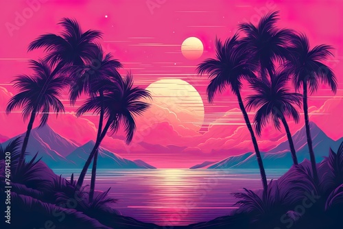 © Umar, Obraz premium Silhouette of palm tree Panorama of sunset of tropical coastline Purple sunset with clouds Violet sunset