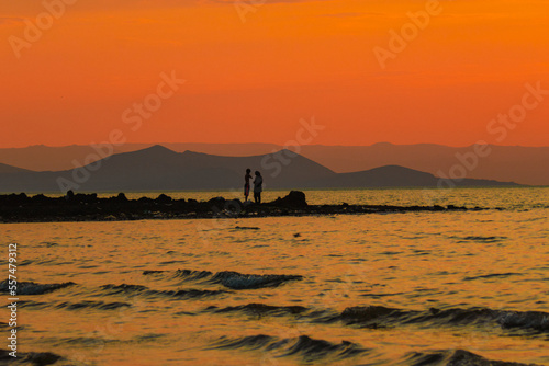© martin, Obraz premium Silhouette of people against golden sunset at Lake Turkana, Loiyangalani District, Turkana, County, Kenya
