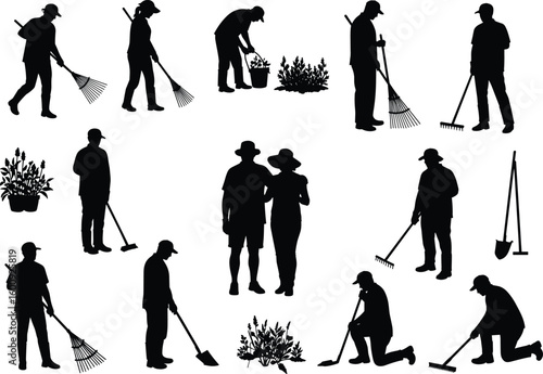 Obraz premium Silhouette of people gardening with rakes, shovels, and plants, including couple and workers in various garden maintenance activities vector