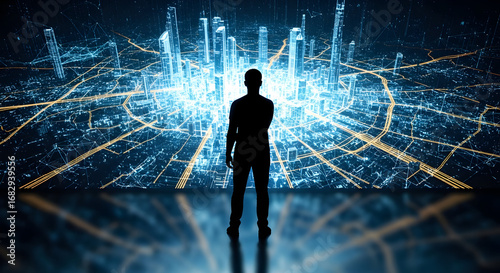 © BimoPrinting, Obraz premium Silhouette of Person Facing Futuristic Cityscape.
