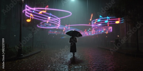 Naklejka premium Silhouette of person with umbrella and neon musical notes on rainy night street