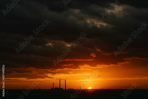 © Zunopixl , Fototapeta premium Silhouette of power lines against a vibrant sunset sky, casting an orange glow over the city landscape with distant windmills generating electricity as night approaches
