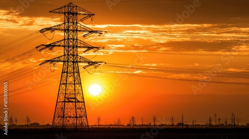 © Jolodong, Fototapeta premium Silhouette of power lines at sunset