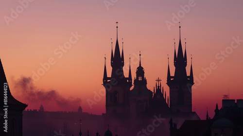 © Generative AI, Obraz premium Silhouette of Pragues towers at dawn : Generative AI