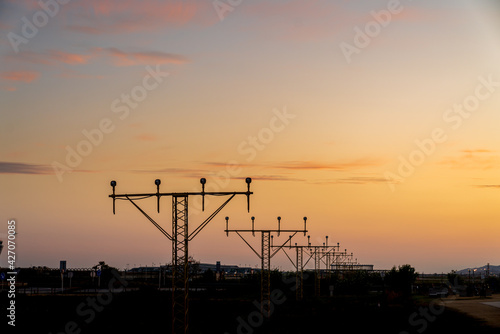 Fototapeta premium Silhouette of runway signs during sunset. In the sky we can see red clouds as...