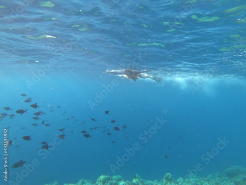 © SunFreez, Fototapeta premium Silhouette of scuba diver and sunlight in the blue water