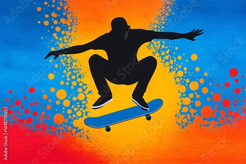© Gatherina, Naklejka premium Silhouette of skateboarder performing trick on colorful background