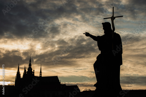 © Zoran, Naklejka premium Silhouette of St. John the Baptist statue on Charles Bridge in Prague with St. Vitus Cathedral in background at sunset.
