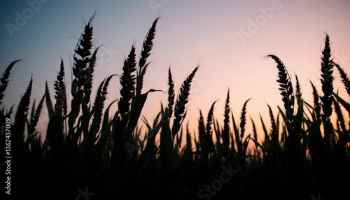 Fototapeta premium Silhouette of tall corn stalks bending gracefully in a breeze, rustic, crop