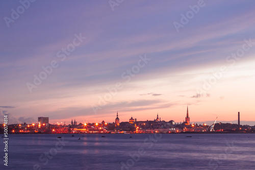© VertigoBarrov, Fototapeta premium silhouette of tallinn with fire sunset