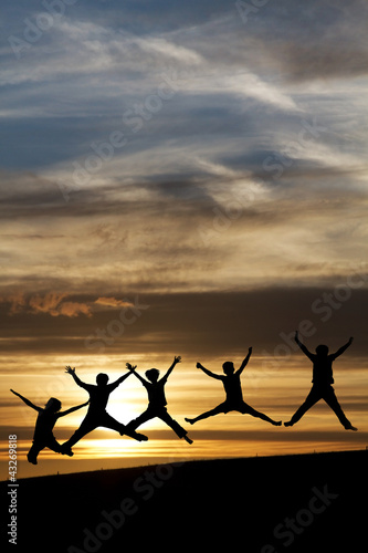 Obraz premium silhouette of teenagers jumping in sunset for fun