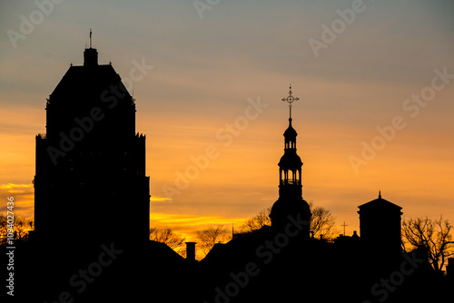 © Atomazul, Fototapeta premium Silhouette of the The Notre-Dame de Québec Basilica-Cathedral church steeple and Édifice Price building among the skyline of Quebec City, Quebec, Canada.