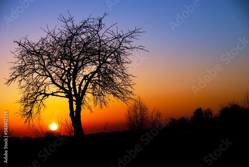 Obraz premium Silhouette of the tree at an orange and blue sunset