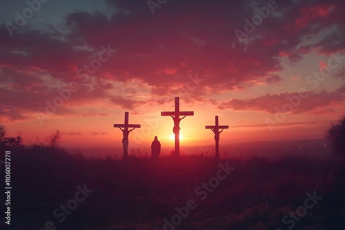 © AI Digital Artist, Naklejka premium Silhouette of three crosses with Jesus hanging on Golgotha ​​hill in red sunset light