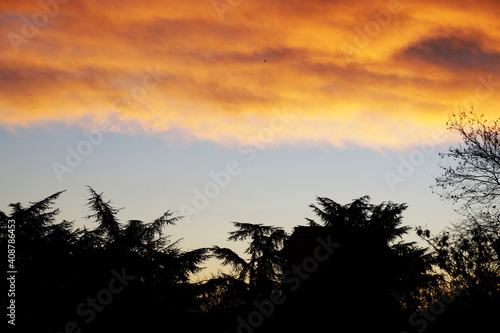 © Anna, Obraz premium silhouette of trees against a background of heavy orange sunset clouds