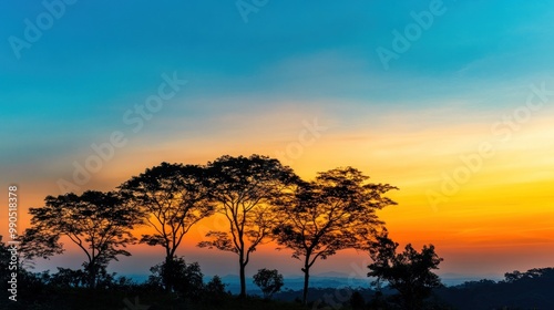 Obraz premium Silhouette of trees against a colorful sunset sky.